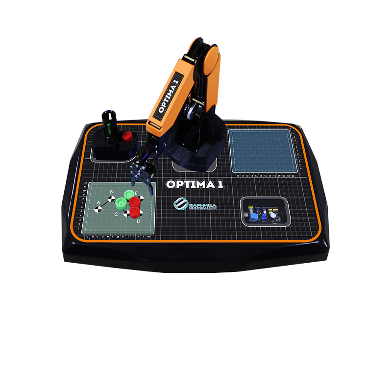 Учебный манипулятор Оптима-1 – образовательный комплекс, предназначенный для обучения учащихся программированию микроконтроллеров, алгоритмизации процессов и основам кинематики. Манипулятор выполнен на базе микроконтроллера Arduino Uno – одном из самых популярных на сегодняшний день. Робототехнический комплекс оснащен манипулятором с тремя степенями свободы и механическим схватом, раздатчиком шайб с датчиком цвета и большим кол-вом вспомогательных датчиков и устройств. По желанию заказчика робот может быть оснащен вакуумным захватом (присоской). Комплекс смонтирован на специальном столе с нанесенной разметкой и цветовым маркированием зон для решения практических задач по перемещению заготовок-шайб.