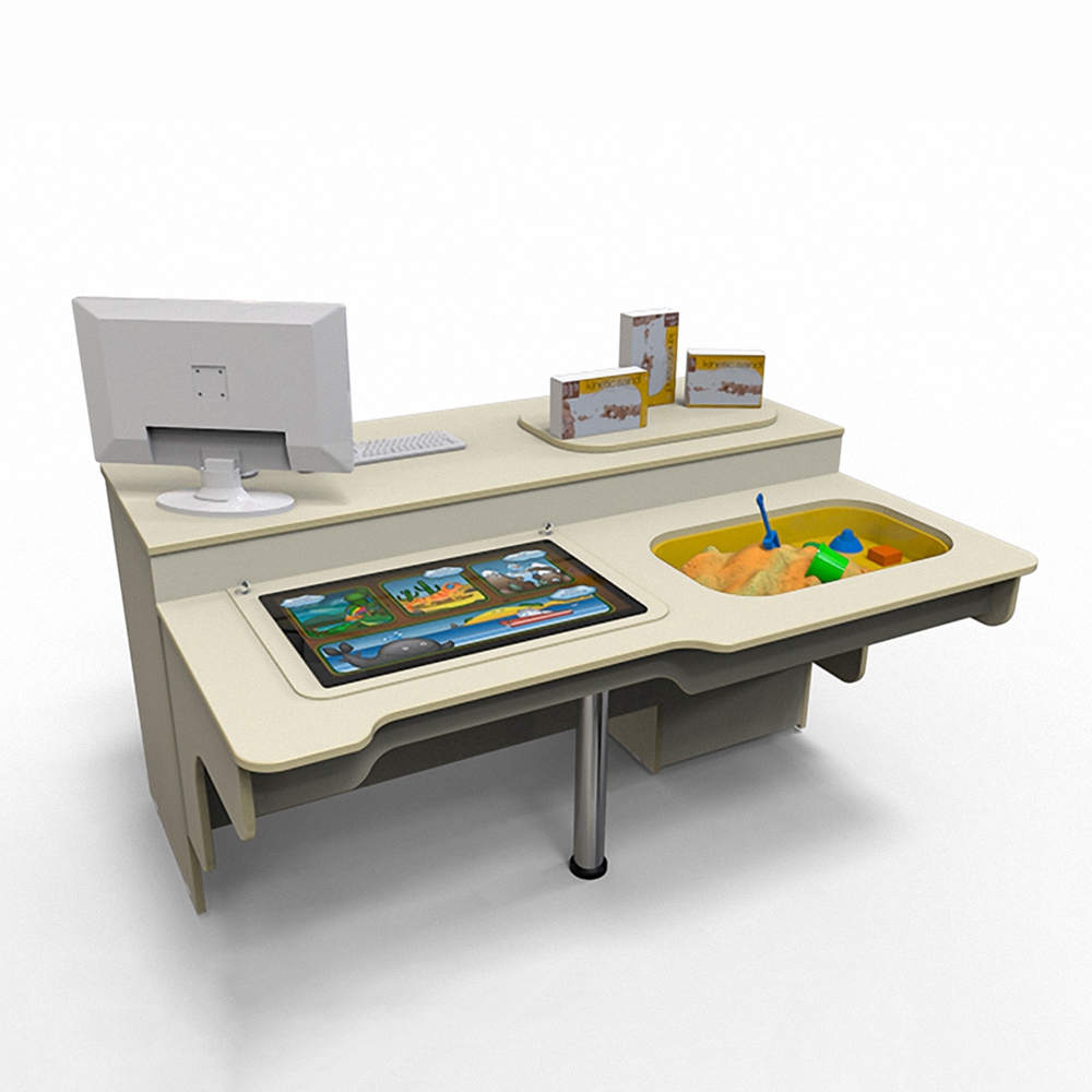 Конструкция стола предусматривает наличие двух оборудованных рабочих мест для педагога и ученика. На месте учителя установлен компьютер (ЦП- Intel Core i3-2.13 Ghz, ОЗУ – 4 Gb DDR4-1600, SSD-120Gb) с 22 дюймовым монитором. На месте ученика вмонтирован планшет с большим 25 дюймовым сенсорным экраном, поддерживающим до 10 одновременных касаний. Также присутствует два микрофона и встраиваемый отсек для творчества (с кинетическим материалом) – он помогает работать над мелкой моторикой ребенка.