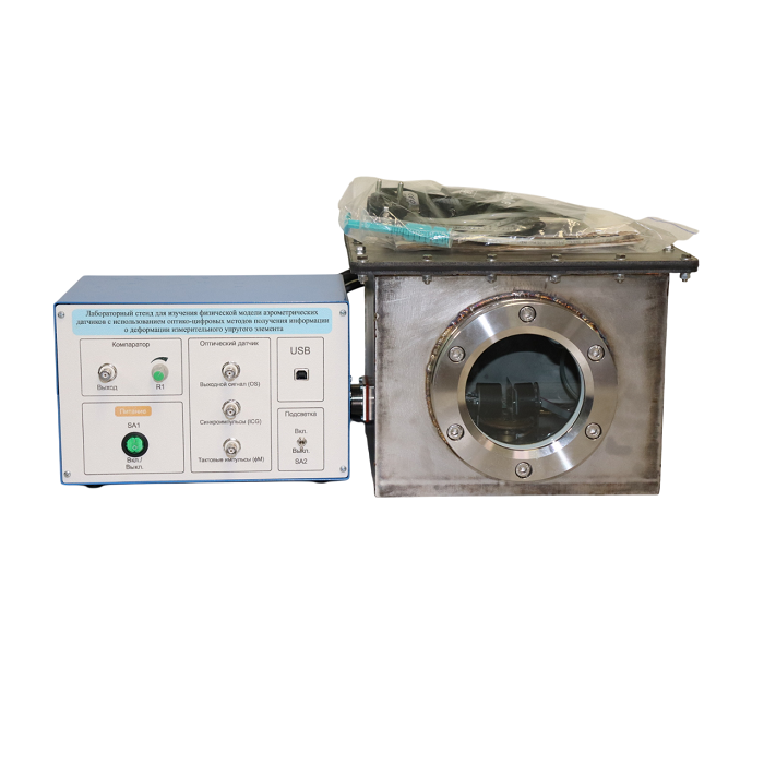 Типовой комплект учебного оборудования "Физическая модель аэрометрического датчика с использованием оптико-цифровых методов получения информации о деформации измерительного упругого элемента" предназначен для изучения принципа измерения деформации упругого элемента с использованием оптико-цифрового преобразователя.